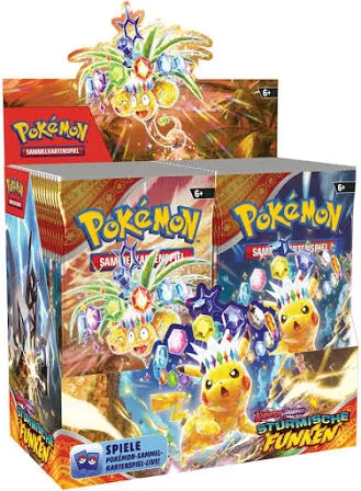 - 9 Boosterpacks der Pokémon-Sammelkartenspiel-Erweiterung Karmesin & Purpur Stürmische Funken